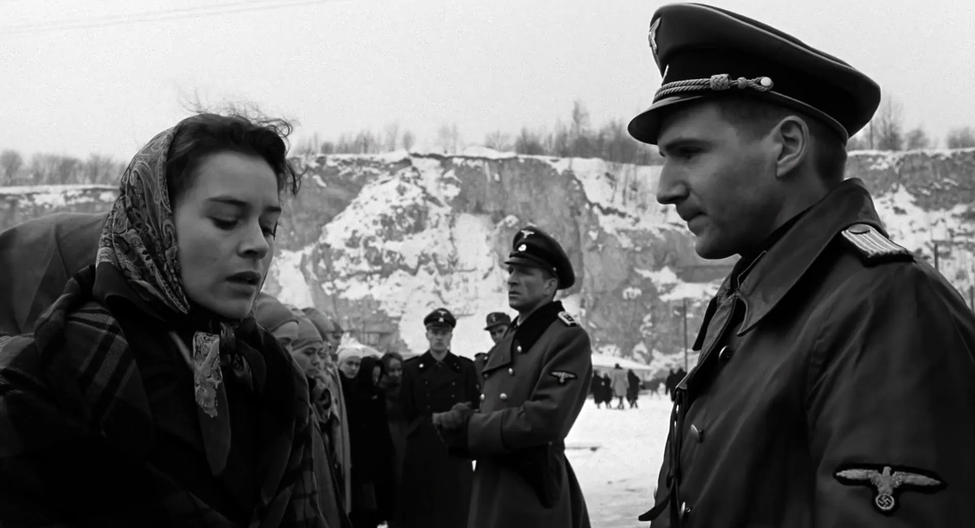 Cast: Liam Neeson as Oskar Schindler, Ben Kingsley as Itzhak Stern, Ralph Fiennes as Amon Goeth, Caroline Goodall as Emilie Schindler, Jonathan Sagall as Poldek Pfefferberg, Embeth Davidtz as Helen Hirsch, Malgorzata Gebel as Viktoria Klonowska, Shmuel Levy as Wilek Chilowicz, Mark Ivanir as Marcel Goldberg, Béatrice Macola as Ingrid, Andrzej Seweryn as Julian Scherner, Friedrich von Thun as Rolf Czurda, Krzysztof Luft as Herman Toffel, Harry Nehring as Leo John, Norbert Weisser as Albert Hujar, Adi Nitzan as Mila Pfefferberg, Michael Schneider as Juda Dresner, Miri Fabian as Chaja Dresner, Anna Mucha as Danka Dresner, Albert Misak as Mordecai Wulkan, Michael Gordon as Mr. Nussbaum, Aldona Grochal as Mrs. Nussbaum, Jacek Wójcicki as Henry Rosner, Beata Paluch as Manci Rosner, Piotr Polk as Leo Rosner, Ezra Dagan as Rabbi Menasha Lewartow, Beata Deskur as Rebecca Tannenbaum, Rami Heuberger as Josef Bau, Leopold Kozlowski as Investor, Jerzy Nowak as Investor, Uri Avrahami as Chaim Nowak, Adam Siemion as OD/Chicken Boy, Magdalena Dandourian as Nuisa Horowitz, Paweł Deląg as Dolek Horowitz, Shabtai Konorti as Garage Mechanic, Oliwia Dabrowska as Red Genia, Henryk Bista as Mr. Löwenstein, Tadeusz Bradecki as DEF Foreman, Wojciech Klata as Lisiek, Elina Löwensohn as Diana Reiter, Ewa Kolasińska as Irrational Woman, Bettina Kupfer as Regina Perlman, Grzegorz Kwas as Mietek Pemper, Vili Matula as Investigator, Stanislaw Koczanowicz as Doorman, Hans-Jörg Assmann as Julius Madritsch, Geno Lechner as Majola, August Schmölzer as Dieter Reeder, Ludger Pistor as Josef Liepold, Beata Rybotycka as Club Singer, Branko Lustig as Nightclub Maitre D', Artus-Maria Matthiessen as Treblinka Commandant, Hans-Michael Rehberg as Rudolf Hoss, Eugeniusz Priwieziencew as Waiter, Michael Z. Hoffmann as Montelupich Colonel, Erwin Leder as SS Waffen Officer, Jochen Nickel as Wilhelm Kunde, Andrzej Welminski as Dr. Blancke, Daniel Del-Ponte as Josef Mengele, Marian Glinka as DEF SS Officer, Grzegorz Damięcki as SS Sergeant Kunder, Stanisław Brejdygant as DEF Guard, Olaf Lubaszenko as Auschwitz Guard, Haymon Maria Buttinger as Auschwitz Guard, Peter Appiano as Auschwitz Guard, Jacek Pulanecki as Brinnlitz Guard, Tomasz Dedek as Gestapo, Sławomir Holland as Gestapo, Martin Semmelrogge as SS Waffen Man, Tadeusz Huk as Gestapo Brinnitz, Alexander Held as SS Bureaucrat, Piotr Cyrwus as Ukrainian Guard, Joachim Paul Assböck as Klaus Tauber, Osman Ragheb as Border Guard, Maciej Orłoś as German Clerk, Marek Wrona as Toffel’s Secretary, Zbigniew Kozłowski as Scherner’s Secretary, Marcin Grzymowicz as Czurda’s Secretary, Dieter Witting as Bosch, Magdalena Komornicka as Goeth's Girl, Agnieszka Krukówna as Czurda’s Girl, Anemona Knut as Polish Girl, Jeremy Flynn as Brinnlitz Man, Agnieszka Wagner as Brinnlitz Girl, Jan Jurewicz as Russian Officer, Wiesław Komasa as Plaszow Depot SS Guard, Maciej Kozłowski as SS Guard Zablocie, Martin Bergmann as SS NCO Zablocie, Wilhelm Manske as SS NCO Ghetto, Peter Flechtner as SS NCO Ghetto, Sigurd Bemme as SS NCO Ghetto, Etl Szyc as Ghetto Woman, Lucyna Zabawa as Ghetto Woman, Ruth Farhi as Old Jewish Woman, Jerzy Sagan as Ghetto Old Man, Dariusz Szymaniak as Prisoner at Depot, Dirk Bender as Clerk at Depot, Maciej Winkler as Black Marketeer, Radosław Krzyżowski as Black Marketeer, Jacek Lenczowski as Black Marketeer, Hanna Kossowska as Ghetto Doctor, Maja Ostaszewska as Frantic Woman, Sebastian Skalski as Stable Boy, Ryszard Radwański as Pankiewicz, Piotr Kadlcik as Man in Pharmacy, Lech Niebielski as NCO Plaszow, Thomas Morris as Grun, Sebastian Konrad as Engineer Man, Lidia Wyrobiec-Bank as Clara Sternberg, Ravit Ferera as Maria Mischel, Agnieszka Korzeniowska as Ghetto Girl, Dominika Bednarczyk as Ghetto Girl, Alicja Kubaszewska as Ghetto Girl, Danny Marcu as Ghetto Man, Hans Rosner as Ghetto Man, Edward Linde-Lubaszenko as Brinnlitz Priest, Alexander Strobele as Montelupich Prisoner, Georges Kern as Depot Master, Alexander Buczolich as Plaszow SS Guard, Michael Schiller as Plaszow SS Guard, Götz Otto as Plaszow SS Guard, Wolfgang Seidenberg as Plaszow SS Guard, Hubert Kramar as Plaszow SS Guard, Razia Israeli as Plaszow Jewish Girl, Dorit Seadia as Plaszow Jewish Girl, Esti Yerushalmi as Plaszow Jewish Girl, Marta Bizoń as Dancer (uncredited), Maciej Kowalewski as Boy (uncredited), Zuzanna Lipiec as Woman (uncredited), Maria Peszek as Young Worker (uncredited), Leopold Pfefferberg as Mourner (uncredited), Leopold Rosner as Mourner (uncredited), Emilie Schindler as Mourner (uncredited), Katarzyna Śmiechowicz as German Girl (uncredited), Steven Spielberg as Liberated Jew (uncredited)